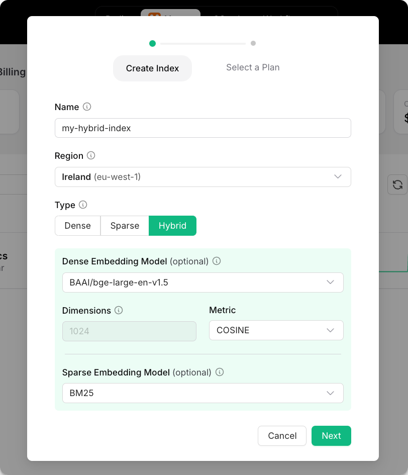To have a place to store these vectors and make them searchable, I'm using an Upstash Vector Hybrid Index. A hybrid index automatically combines full-text and semantic search when a query is run against it. If you want to copy my exact settings, create your index with the following settings (they work very well for me)