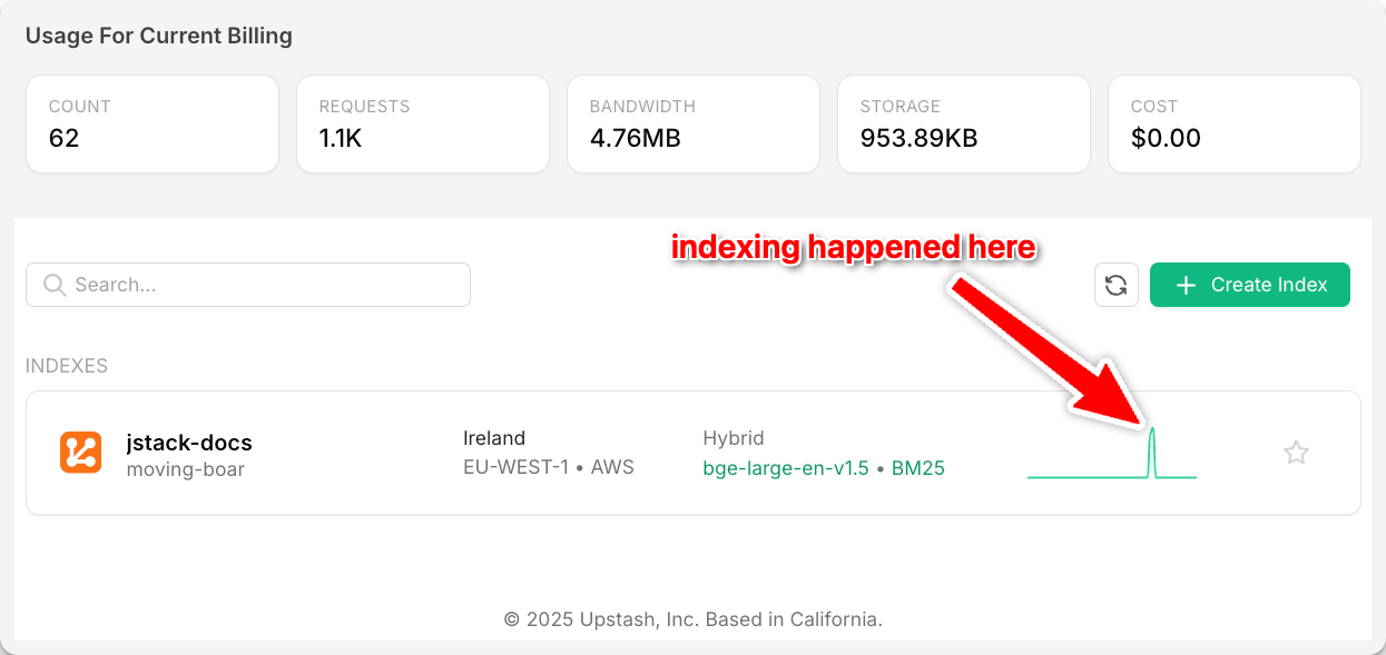 After copying the index environment variables into our indexing script and running it, we'll see that our entire docs appear as searchable vectors in our Upstash vector database. In the case of JStack, that's 62 vectors, each representing a section of the docs: