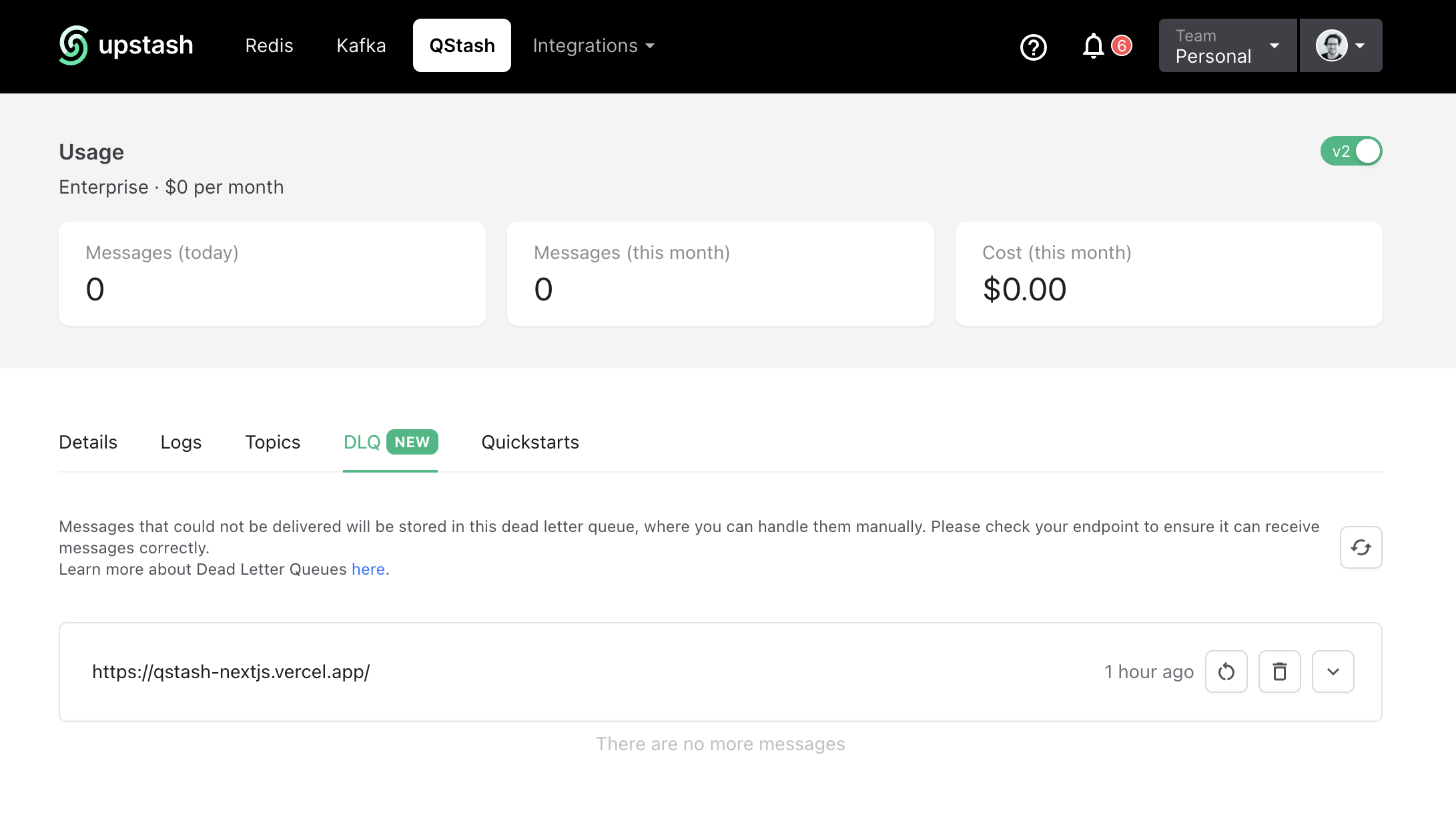 Dead Letter Queues (DLQ): One of the standout features of QStash 2.0 is the introduction of DLQs. Handling failed messages effectively has always been a challenge, and DLQs provide an elegant solution. When a message repeatedly fails to be delivered, it is moved to the DLQ, allowing developers to investigate issues, resolve them and finally republish the messages to ensure every single message will be delivered.