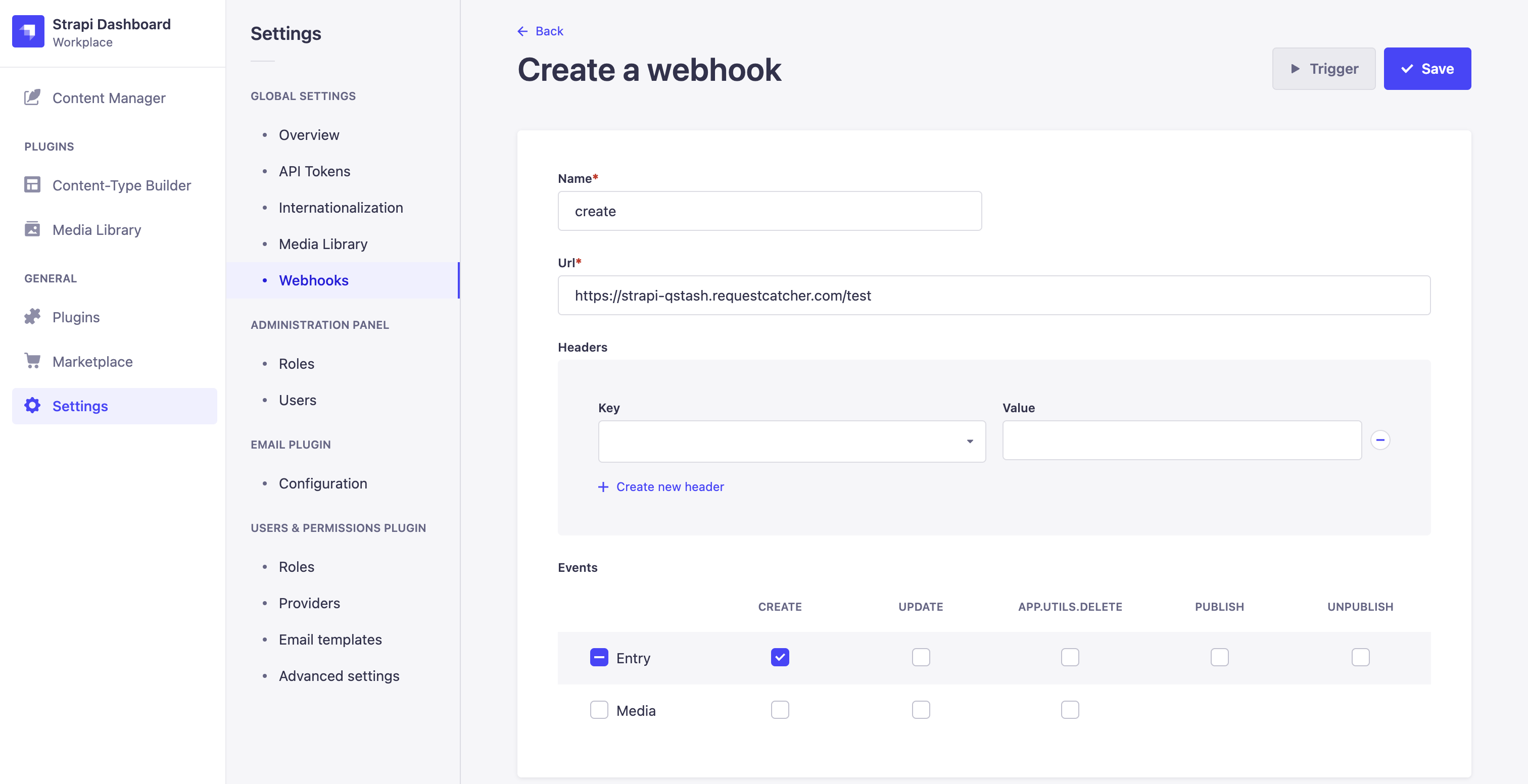 After you have created your admin account, go to http://localhost:1337/admin/settings/webhooks/create and fill in the form to create a webhook.