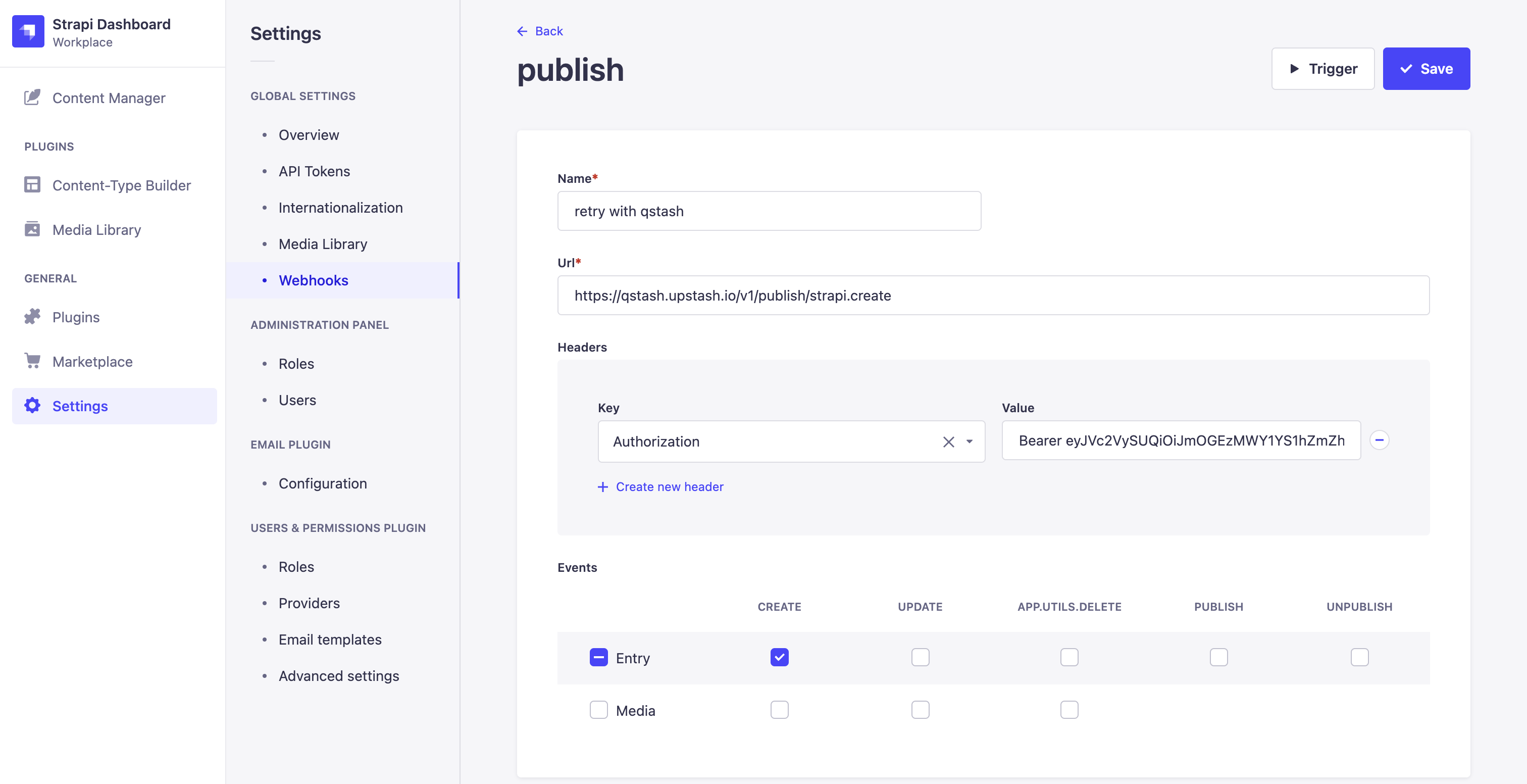 Strapi is now sending the webhook to QStash and using the QSTASH_TOKEN
